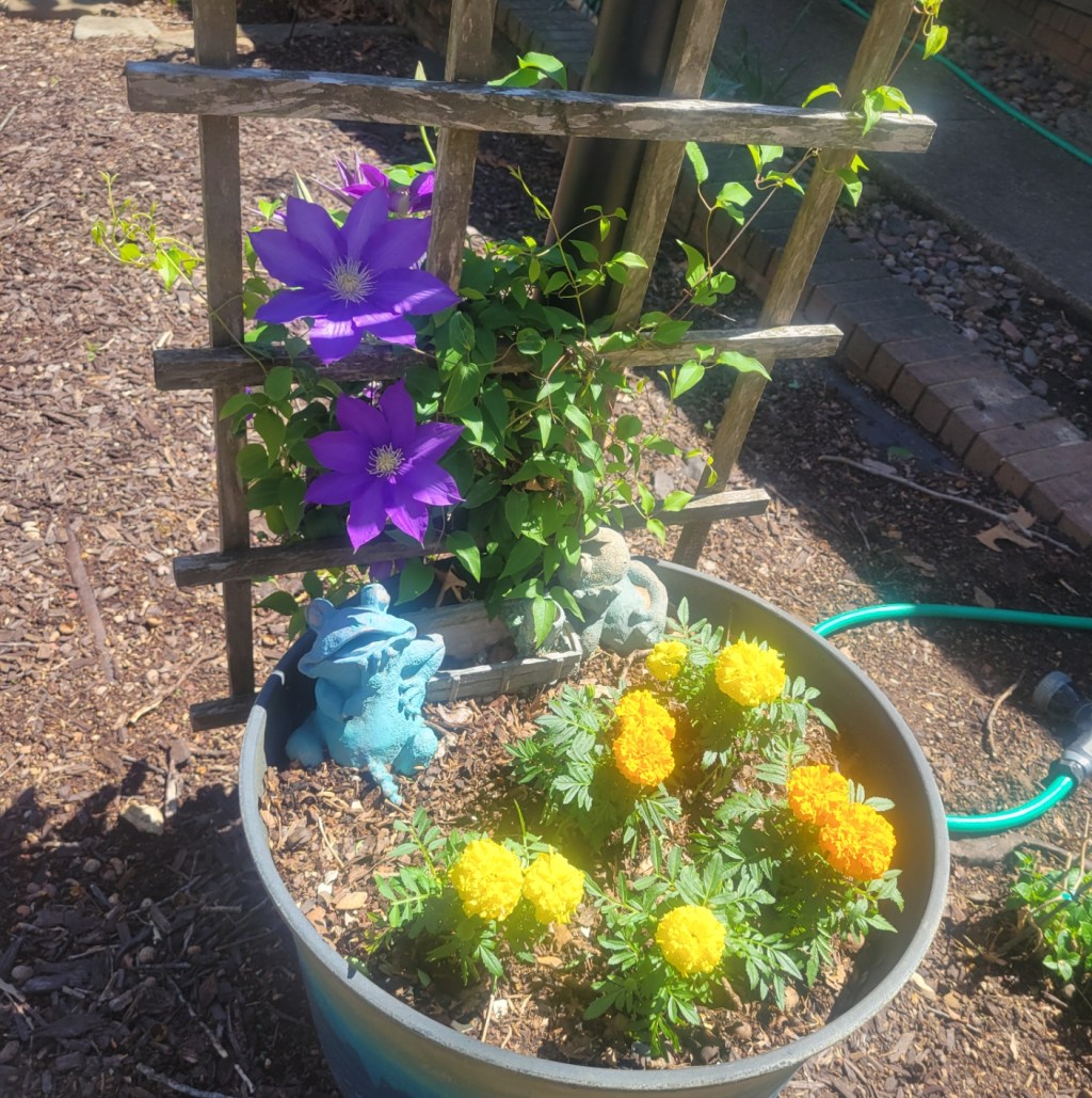 In other news, I want to share the story of my clematis (pictures above). First, you must understand that my Clematis isn’t “just a plant” to me. I feel very sentimental about it… My son and I planted it together in 2020, during the first spring in our new house. My daughter would have been a newborn, during that first year of the pandemic. Despite being brand new, the Clematis bloomed beautifully in 2020 and every year thereafter… except for last year. In 2025 after several deep freezes, my beloved clematis never emerged from the Earth. … just a pot filled with dirt. Despite all evidence to the contrary, I refused to believe that my plant was dead. I continued to water it as though it were alive. So unconvinced was I in the not-deadness of my Clematis, that I would “send” (via telepathy, of course) the plant some hope and a bit of love everyday. I would also imagine the barren plant pot as having my blossoming Clematis, growing peacefully. Almost every day I did this, the pot is located along the driveway leading into the front door of our house. I would pass by the pot, almost every single day, and each time I saw the pot, I visualized my Clematis growing beautifully and filled my heart with the love I had for my Clematis.