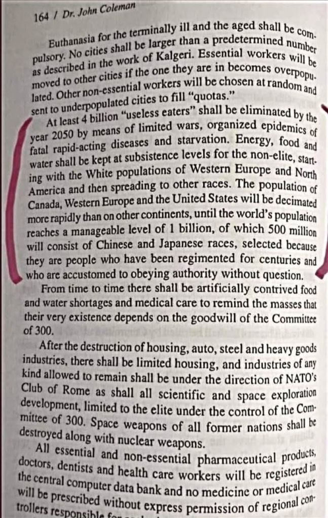 Anyway, this is all very low-vibration and I want to get my energy out of this space. But, have you ever wondered why the people of the United States still don’t have universal health care? As compared with other “similar” countries, the United States is definitely an outlier in terms of taking care of its citizens. Health care, education, social programs… the US is notably lacking in those specific areas. It’s almost as if some entity wants the American people to be sick / dying / dead, uneducated / stupid, and poorly connected. I also wonder if that same entity (leader, group, ???) wants Americans to be deeply divided as a people. I then wonder about the sentence in the above passage, “At least 4 billion “useless eaters” will be eliminated… the populations of Canada, Western Europe and the United States will be decimated more rapidly than on other continents…”